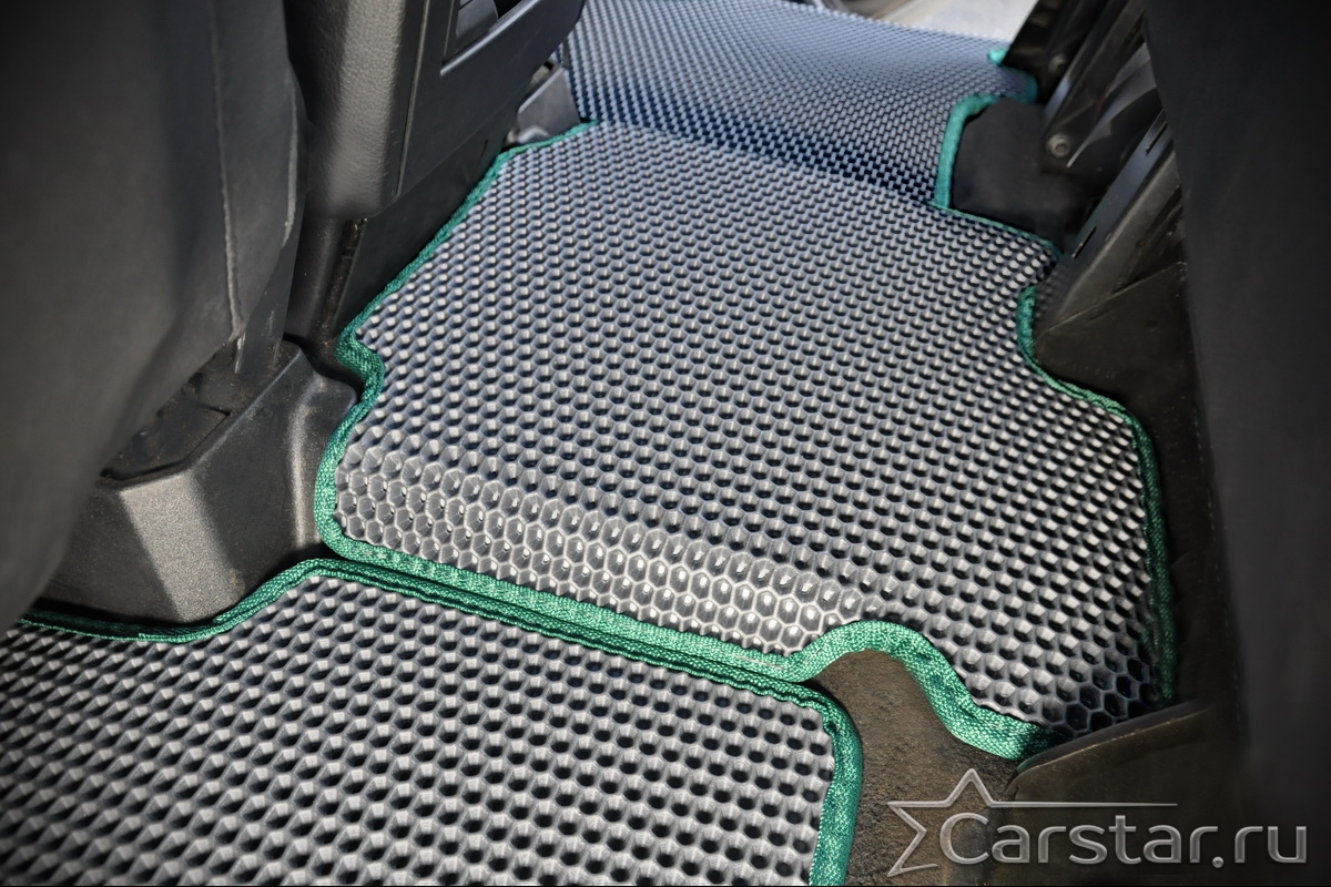 Толщина ковриков EVA составляет 10-12 мм. Глубина ячеек 7-8 мм. Такая толщина ковриков позволяет им служить довольно долго, не протираясь до 3 лет. А благодаря такой глубине ячеек коврик EVA площадью 1 кв.м. способен захватить около 3,5 л жидкости, сохраняя в чистоте вашу обувь и обивку салона.