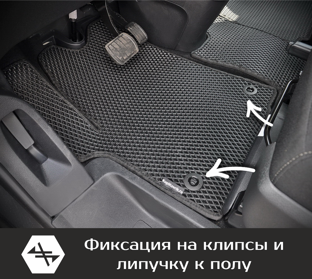 Коврики EVA надёжно крепятся с помощью оригинальных систем фиксации. Благодаря клипсам и липучке коврики защищены от смещений, что обеспечивает комфорт и безопасность вождения. Максимальное удобство также достигается точными, улучшенными лекалами для каждого автомобиля.