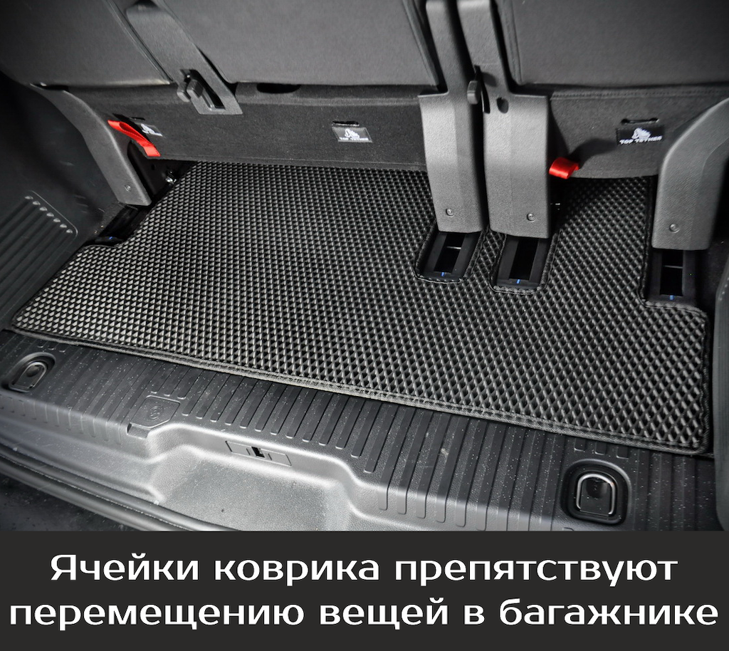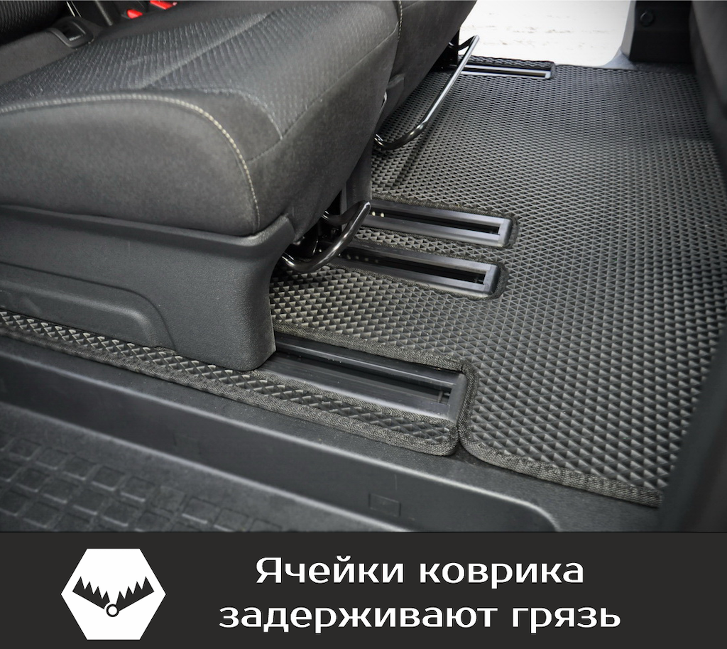 Изделия EVA имеют специальную ячеистую структуру (ячейки глубиной 8 мм), которая эффективно задерживает грязь и воду, оставляя вашу обувь и поверхность обивки салона или багажника абсолютно чистыми. Также эти ячейки очень легко и быстро очищаются без применения специальных инструментов, в том числе, при помощи бесконтактной мойки.